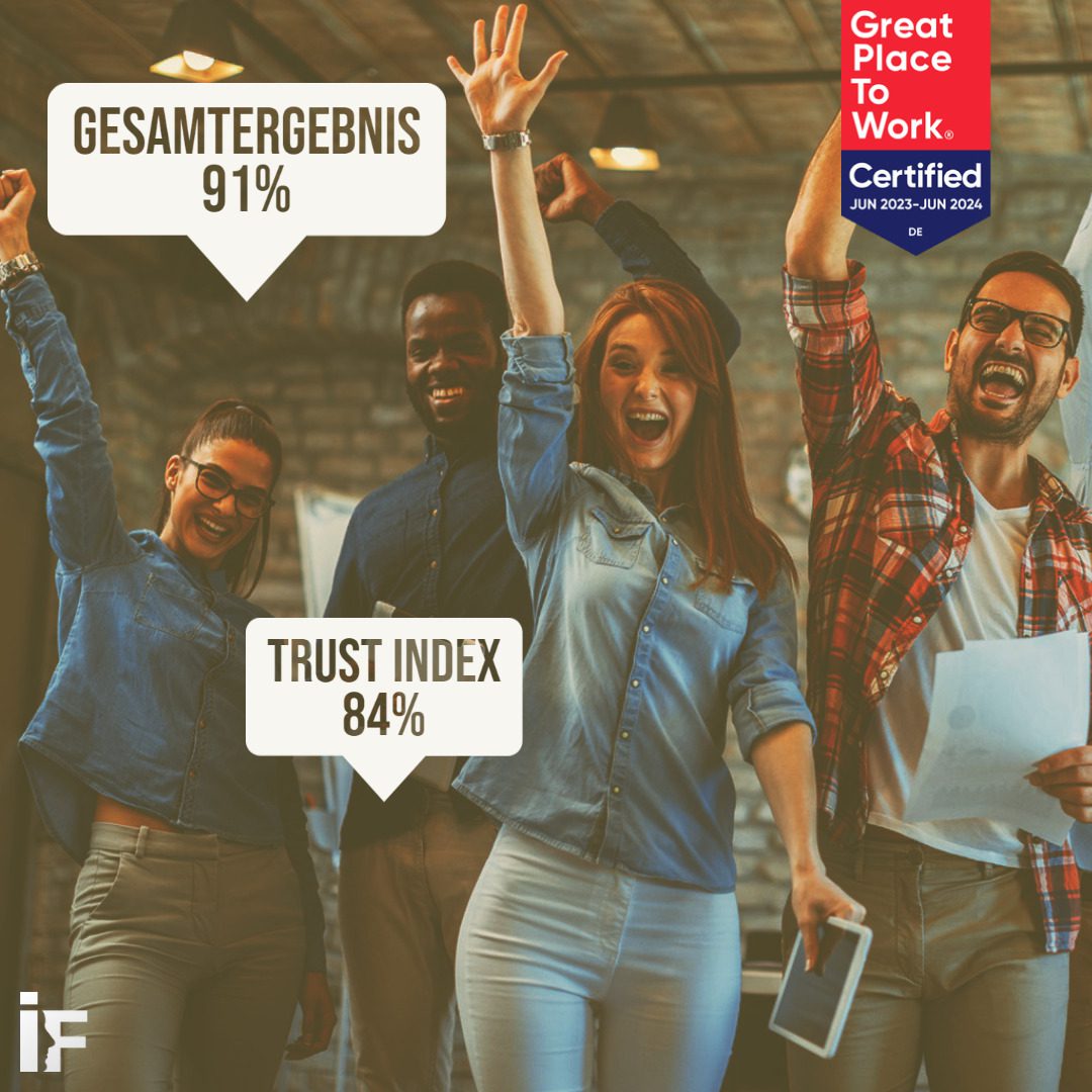 Auch im Vergleich zur Deutschen Norm und in der direkten Branchen-Gegenüberstellung bleiben die Ergebnisse nach GPTW-Standards sehr gut. Für uns keine Selbstverständlichkeit, sondern der Verdienst aller iFler*innen, die Tag für Tag außerordentliches leisten und die Firma zu einem Wohlfühl-Ort machen.